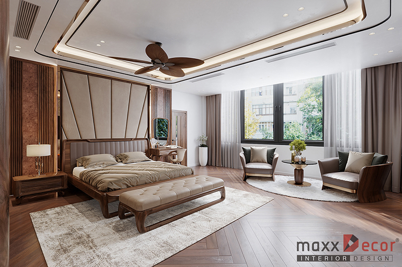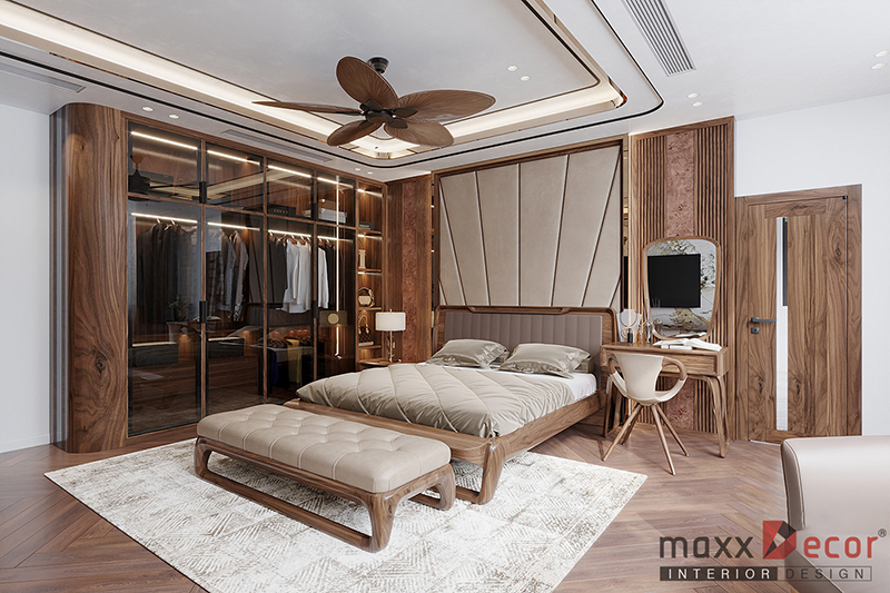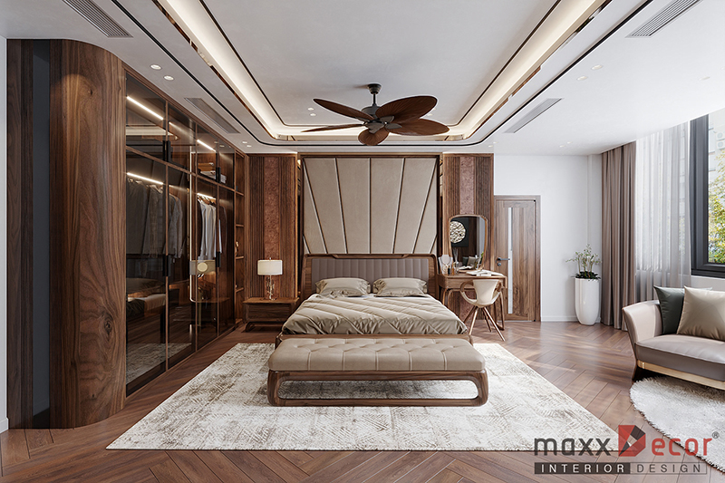 Thiết kế nội thất phòng ngủ biệt thự với gỗ óc chó