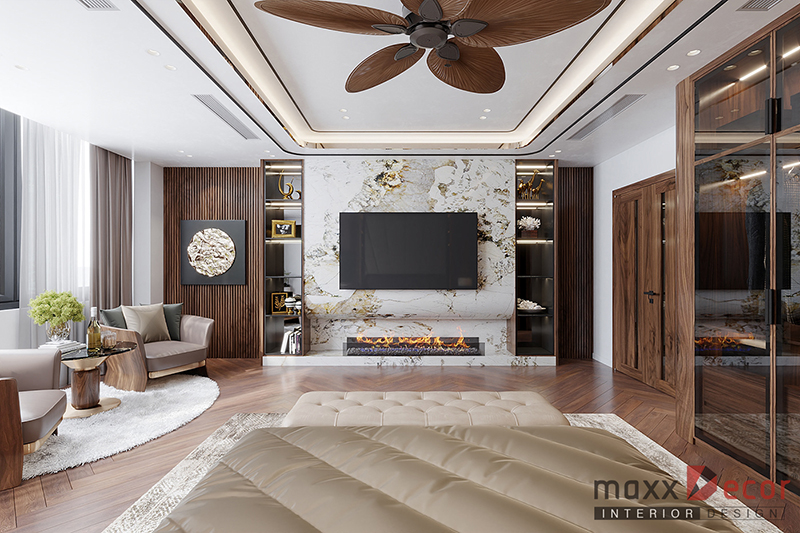 Phòng ngủ master với nội thất gỗ óc chó vô cùng sang trọng tiện nghi với hệ kệ ti vi, hệ thống lò sưởi bàn trà thể hiện đẳng cấp quý tộc.