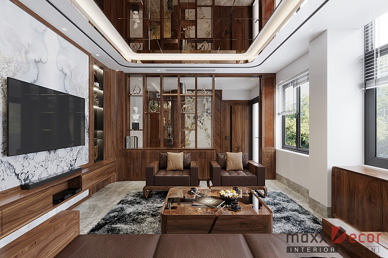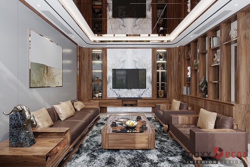 Không gian thiết kế nội thất phòng khách biệt thự gỗ óc chó