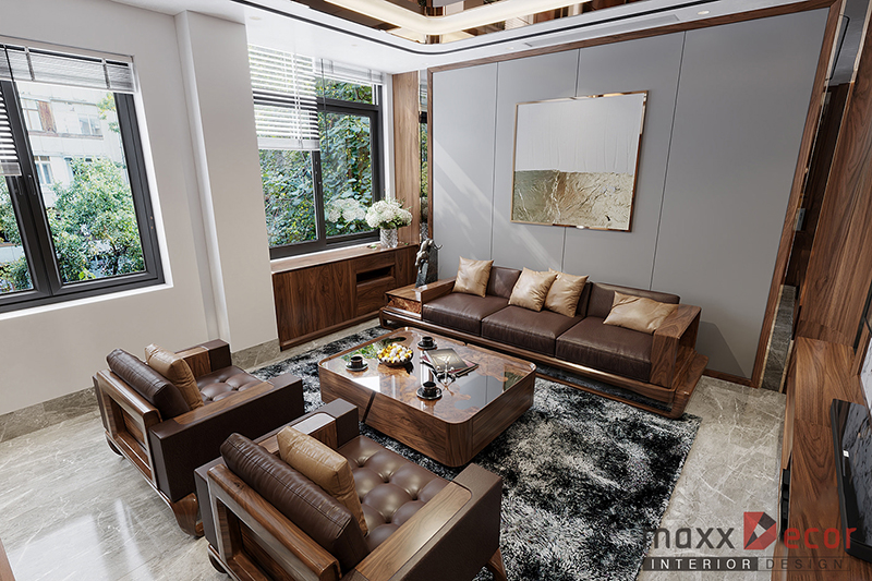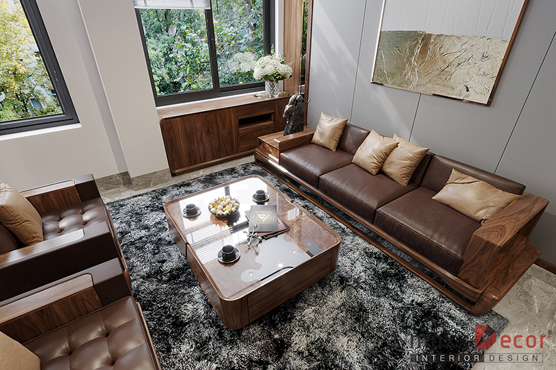 Nội thất phòng khách biệt thự gỗ óc chó là sự lựa chọn tuyệt vời để tạo nên không gian tiếp khách sang trọng, đẳng cấp và ấm cúng