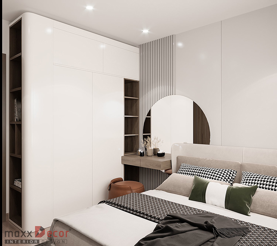 Phòng ngủ master một không gian tràn đầy cảm xúc, giường ngủ và hệ tủ quần áo kết hợp với bàn trang điểm tiết kiệm tối đa không gian diện tích