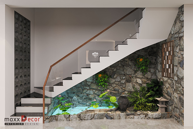 Chân cầu thang được làm tiểu cảnh với hồ sen nhỏ cho góc không gian sinh động